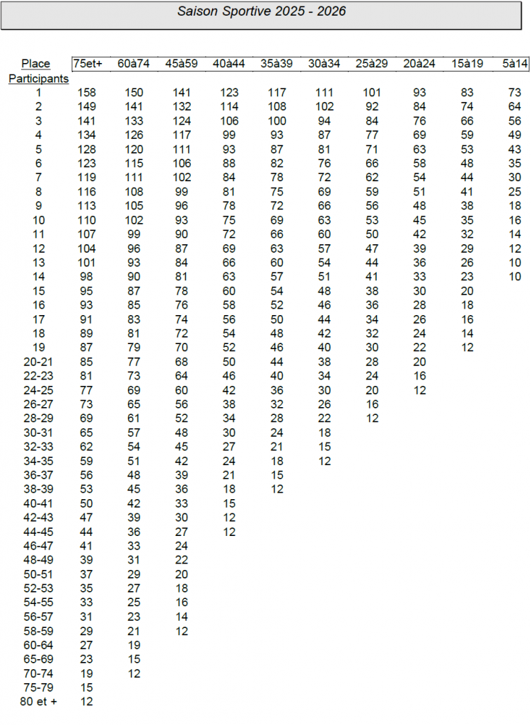 Le nombre de points attribués est fonction de la place obtenue dans l’épreuve et du nombre d’engagés (voir : art.11. Table de cotation des Championnats Régionaux).